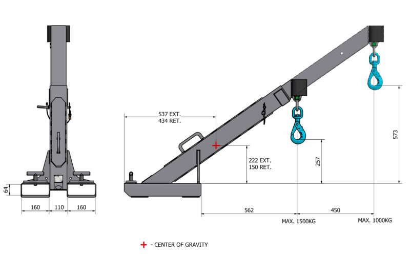 Teleskooppinen rakenne mahdollistaa joustavan ja turvallisen käytön eri kuormitustilanteissa. Nostokyky on jopa 1500 kg sisään vedettynä ja 1000 kg täysin ulos työnnettynä. Lukitus tapahtuu varmalla sokkatapilla, joka estää tahattoman liikkeen käytön aikana.