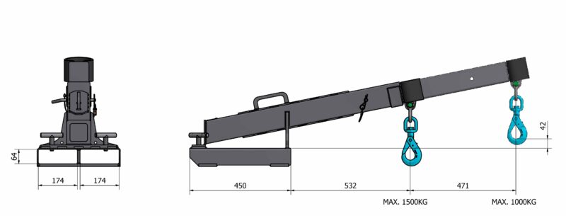Nostopuomin teleskooppirakenne mahdollistaa joustavan käytön eri työtilanteissa. Nostokyky on jopa 1500 kg sisään vedettynä ja 1000 kg täysin ulos työnnettynä. Lukitus tapahtuu varmalla sokkatapilla. Puomi painaa vain 45 kg, joten se on kevyt käsitellä mutta silti erittäin kestävä. Täysin galvanoitu teräsrakenne takaa pitkän käyttöiän ja hyvän korroosionkestävyyden.